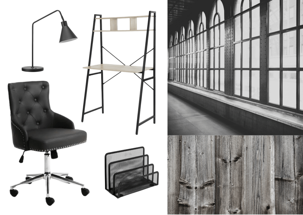 Wood, iron, leather and studs… it’s what industrial interior dreams are made of. I love the idea of this being even more architectural by doing it in monochrome, though you could go lighter if you want. I decided to make this look dark and moody with lots of black. The desk accessories contrast well with the lighter wood desk.