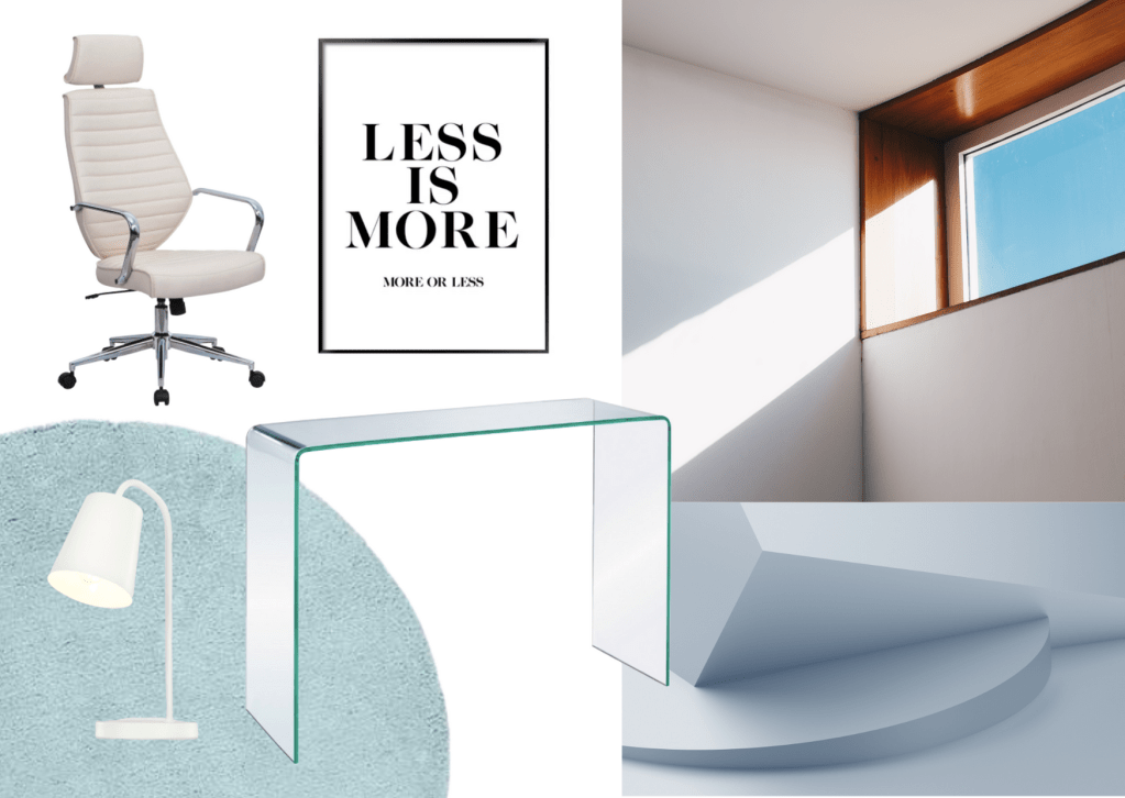 Glass, white, chrome all scream minimal and clean looking to me. To really achieve this look, you want a desk with no clutter, no pen pots and desk organisers. Keep it to the bare minimum – that’s the whole point.