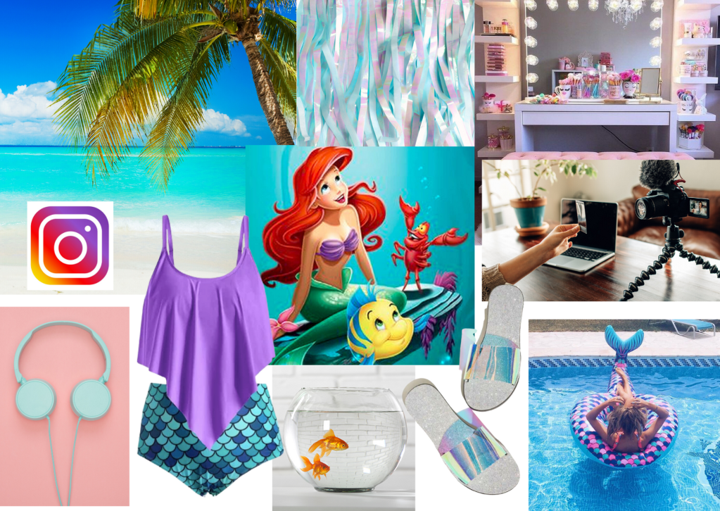 Anyway… I see Ariel as a make-up vlogger on YouTube and Instagram influencer, specialising in mermaid make-up, with a love of all things aquatic and holographic. She has a vast make up collection, which, you know, helps with the vlogging and tutorials. She lives by water, loves holidaying by a beach, or sunbathing by a pool, obviously with her favourite mermaid tail pool float. She lives a relaxed easy going life.