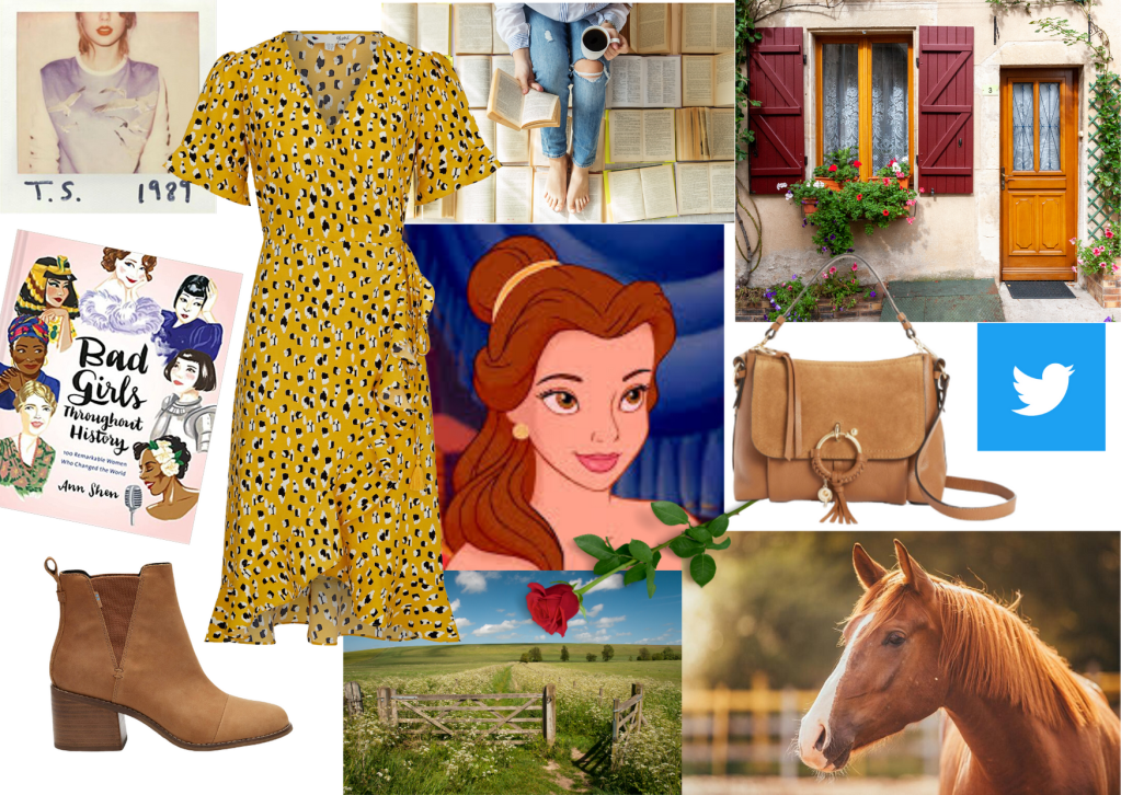 I read online somewhere that Belle is 17 – so I’ve taken that into consideraiton when putting this together. I believe she’s a country girl, living out in a cute cottage with her family and a stable for her horse. She likes music with meaningful lyrics and is a big fan of Taylor Swift for her strength. She reads books featuring strong women, and takes to Twitter to voice her opinions, share petitions for causes she believes in.