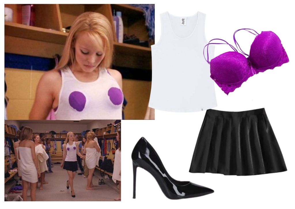 Purple bra + White tank top with DIY “boob holes” + black mini skirt + heels