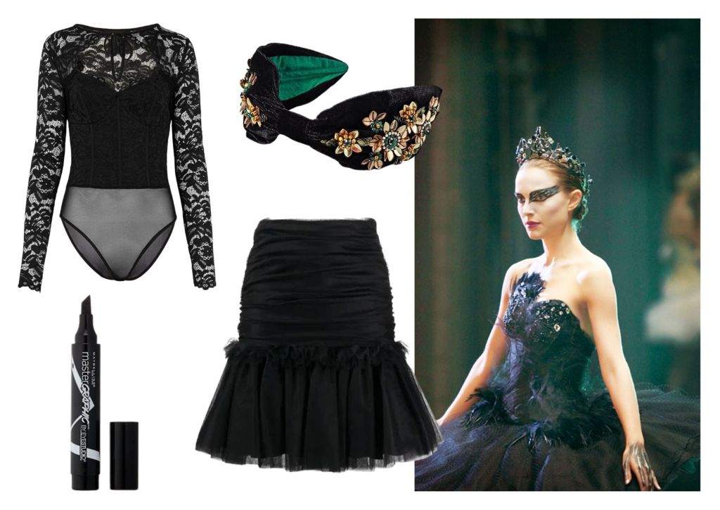 black bodysuit + black tutu + jewelled headband + dramatic cat eye