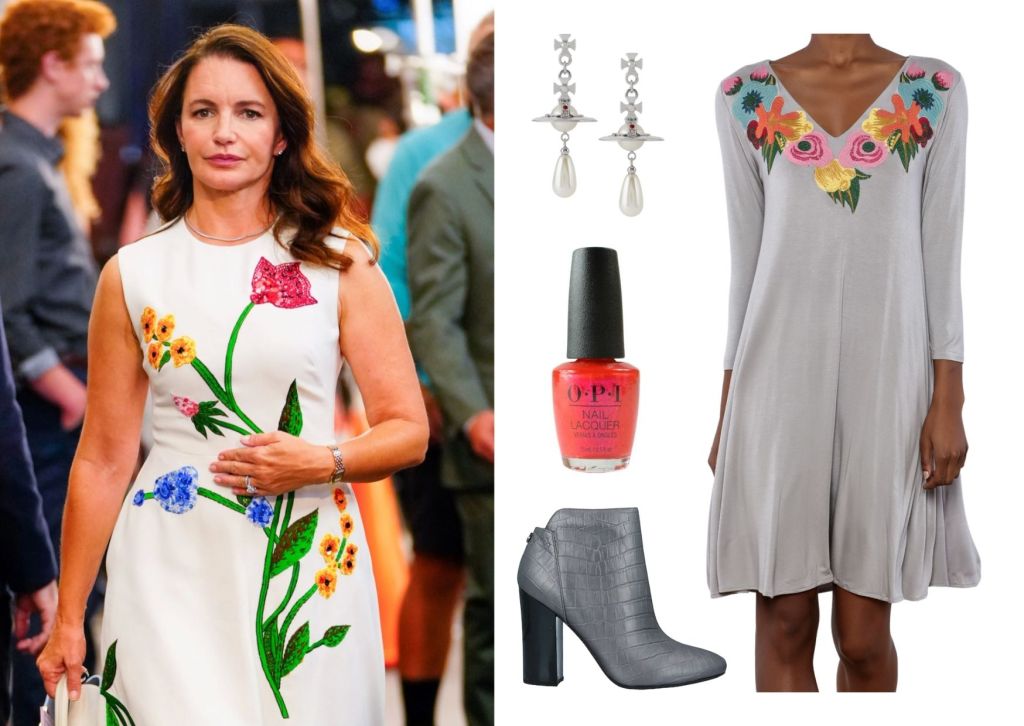 Oh, Charlotte. She’s still as chic and polished as ever. I love the bold embroidery on this dress, which does all the talking so doesn’t need dressed up much. I’ve teamed this grey floral detail embroidered dress with some pearl drop Vivienne Westwood earrings, a pop of colour for those nails and some clean, classic high heeled grey ankle boots.
