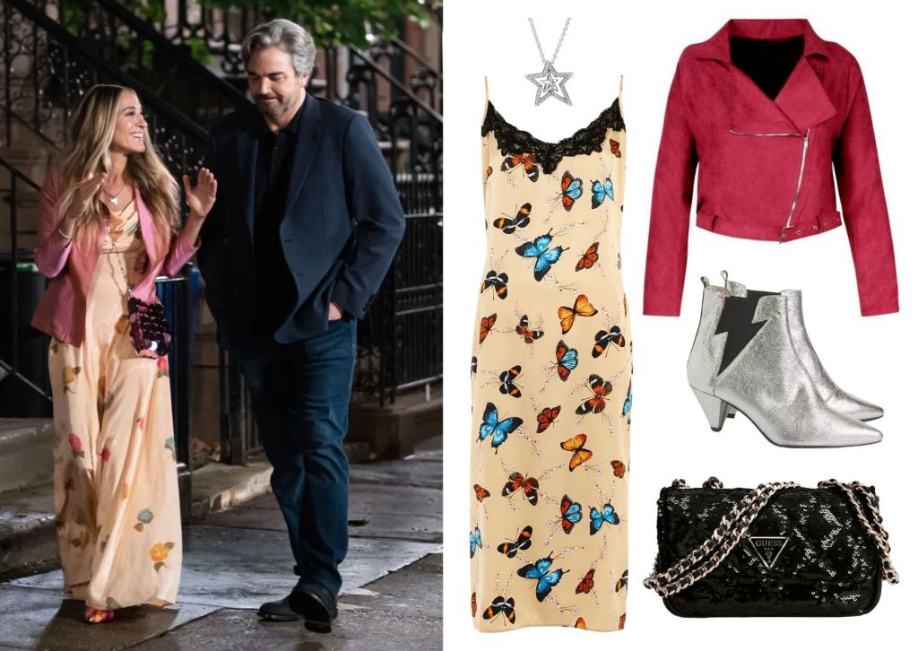 Carrie is still as fabulous and quirky as ever. I wouldn’t choose a maxi dress at this time of year though, so I’ve opted instead for a slip camisole dress with biker jacket and ankle boots. I love the black trim detail that is on the dress, along with the black all over sequin bag. For the finishing touch, what’s quirkier than metallic thunderbolt chelsea style kitten heel ankle boots?